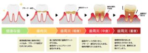 まずは健康な歯の周りに磨き残し(プラーク)や歯石がつくと歯肉に炎症が起こり、これが歯肉炎の状態です。その後、プラークや歯石が歯肉の中にたまり骨も少しずつ溶け始めてくるのが軽度歯周病です。歯茎の腫れも悪化し、骨吸収も進んでいくと中度歯周病です。重度歯周病になると、歯茎もさがり根も露出してきて歯がグラグラしてきます。