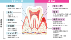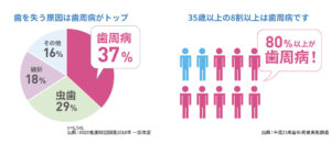 歯周病は細菌の感染によって引き起こされる炎症疾患で、歯の周りの歯茎(歯肉)や歯を支える骨などが溶けてしまう病気です。歯周病は歯を失う原因の1位で、35歳以上の8割以上が歯周病に罹患していると言われてます。